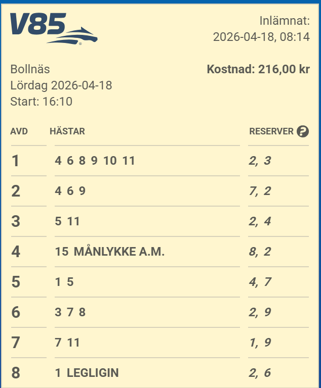 En jackpot på 46 miljoner väntar på dagens V85 som avgörs på Bollnästravet. Cai$$a hänger på med ett system över 432 rader (216,-). Må hästarna springa vår väg!