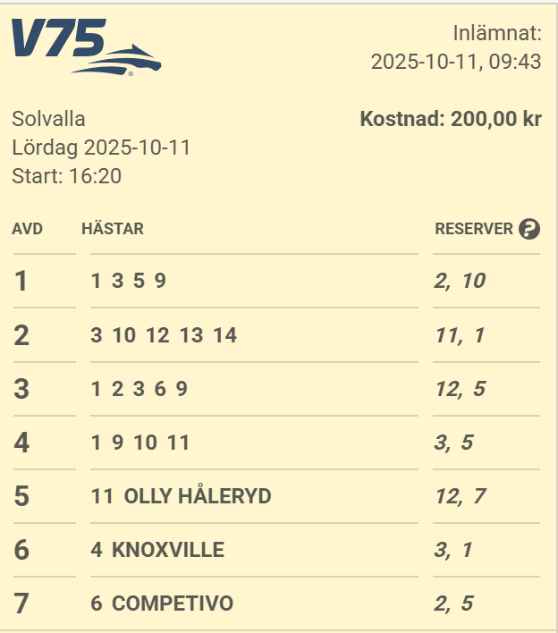 Travcirkusen har stannat till vid huvudstadsbanan Solvalla. Fina lopp och dessutom en stor jackpot om 50 miljoner. David Nygren har satt ihop en rad som enligt honom är ”TV-mässig” dvs. spikarna (3 till antalet dessutom Mikael Forsberg!) är i de sista loppen. Vi har tippat för 200,- (400 rader).