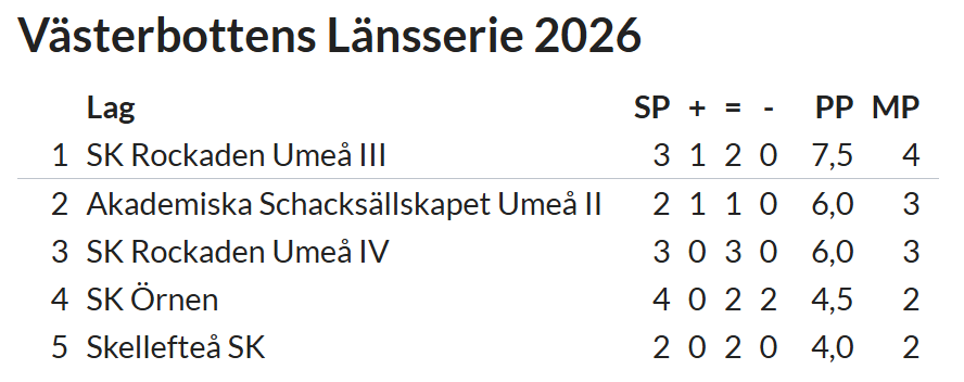 När 4 ronder av 5, sånär på en uppskjuten match, spelats av årets Länsserie så toppar Rockaden III Umeå en jämn serie. Faktum är att av sju matcher hittills har fem stycken slutat 2-2(!) Föga förvånande blev det just de resultaten i dagens matcher där bl a ett umederby stod på programmet. Sista ronden av Länsserien spelas helgen 25-26 april. Bordsresultat.